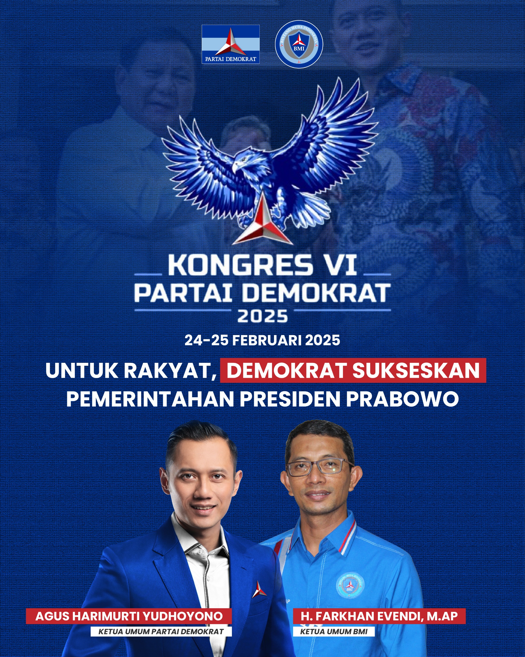 “Atas nama BMI, kami mengucapkan selamat atas terpilihnya Pak SBY sebagai Ketua MTP. Kami juga mengucapkan selamat kepada Mas AHY yang terpilih kembali sebagai Ketua Umum Partai Demokrat. Kami optimis Mas AHY akan mampu membawa Partai Demokrat kembali berjaya. BMI akan selalu mendukung semua kebijakan Ketum AHY dan menjadi garda terdepan dalam menjaga kehormatan dan martabat Partai Demokrat,” tegas Cak Farkhan.