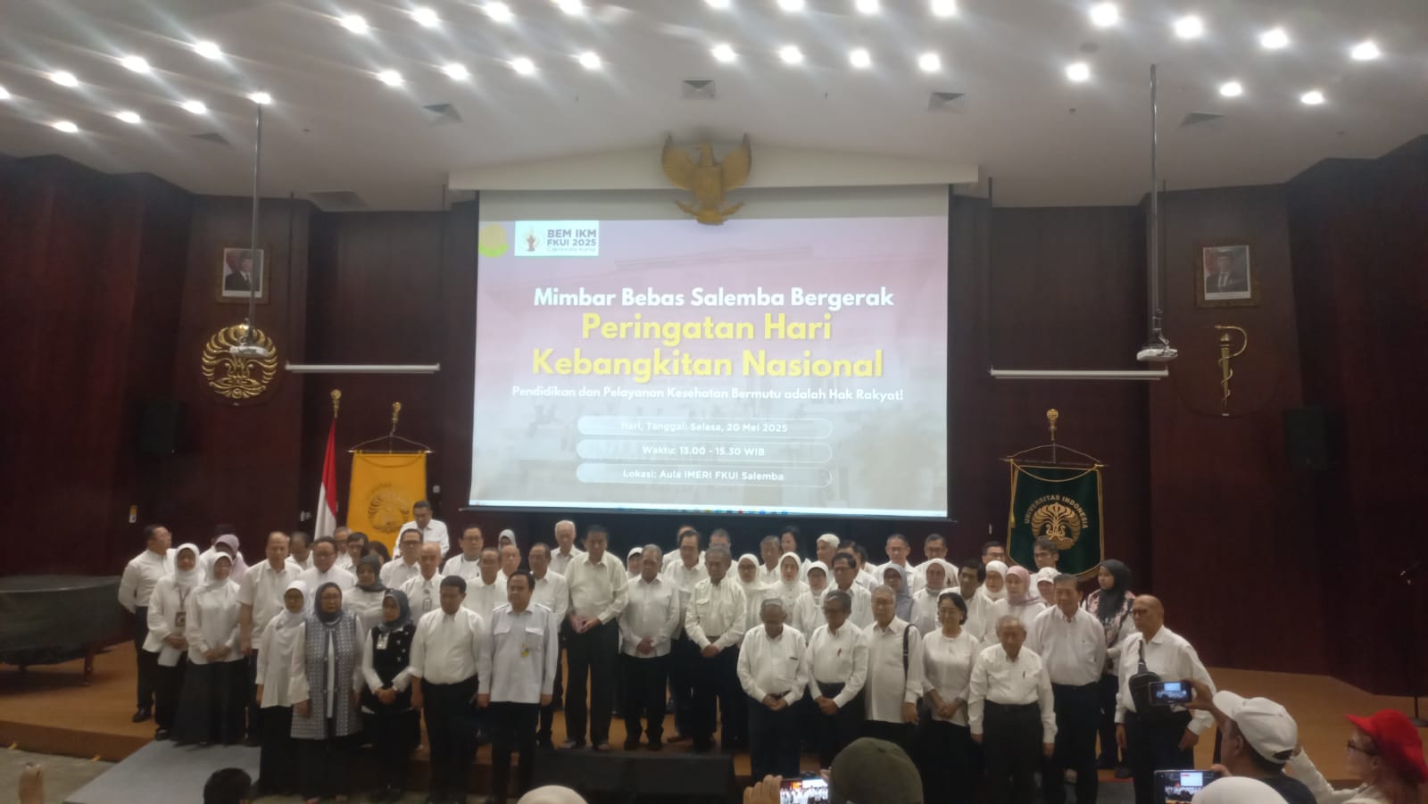 Chakra – News . Com //Jakarta, 20 Mei 2025 — Dalam rangka memperingati Hari Kebangkitan Nasional ke-117, Ikatan Alumni FKUI (ILUNI FKUI) bersama Badan Eksekutif Mahasiswa Senat Mahasiswa FKUI (BEM SM FKUI) menyelenggarakan acara Mimbar Bebas Salemba Bergerak di Aula IMERI FKUI, Salemba. Acara ini berlangsung dari pukul 13.00 hingga 15.30 WIB dan dihadiri oleh mahasiswa, dosen, alumni, serta tokoh-tokoh penting di bidang pendidikan kedokteran dan kesehatan Indonesia.