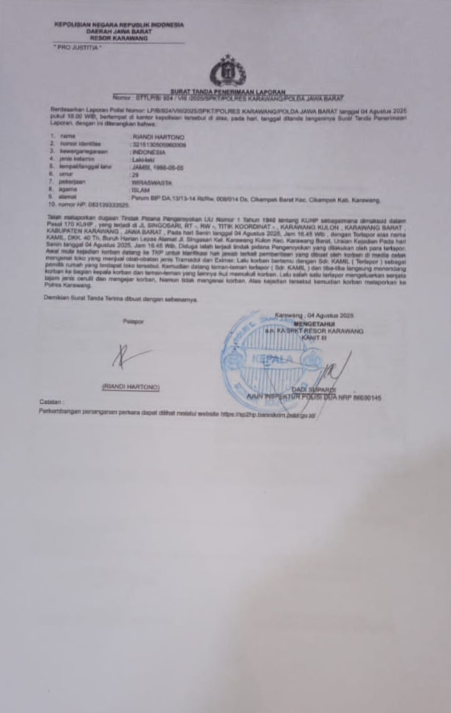 Karawang // chakra-news.com– 4 Agustus 2025 — Dunia jurnalistik kembali dikejutkan oleh tindakan kekerasan terhadap wartawan. Riandi Hartono, jurnalis dari media teropongrakyat.co, menjadi korban penganiayaan brutal saat meliput dugaan peredaran obat-obatan terlarang jenis golongan G di sebuah toko di Jalan Singasari, Karawang Kulon, Karawang Barat.